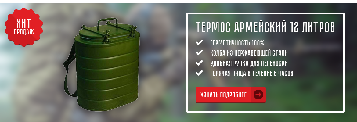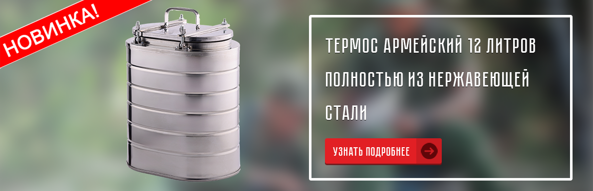 Хотите, чтобы Ваш обед оставался надолго горячим, вкусным и полезным? Армейские термосы сохранят пищу горячей в течение длительного времени и в любой «чрезвычайной ситуации»: на сенокосе, уборке картофеля или на сплаве. Бачок из нержавеющей стали, герметичная крышка, удобные ручки для переноски – это секрет успеха данных термосов.
